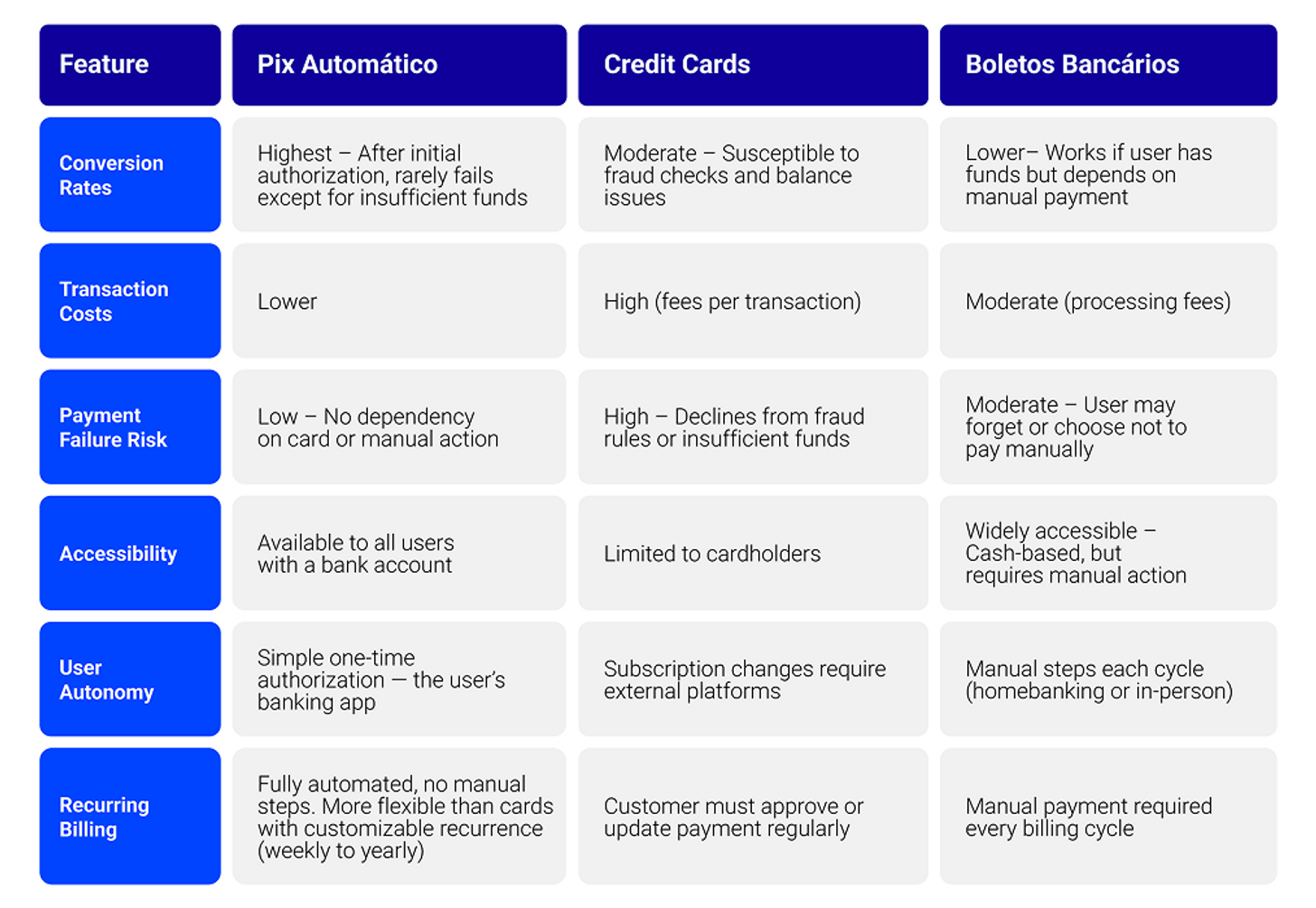 - Inclusive and accessible: By eliminating the dependency on credit cards, Pix Automático extends reach to millions of underbanked users in Brazil who rely on their bank accounts but may not have access to card networks.